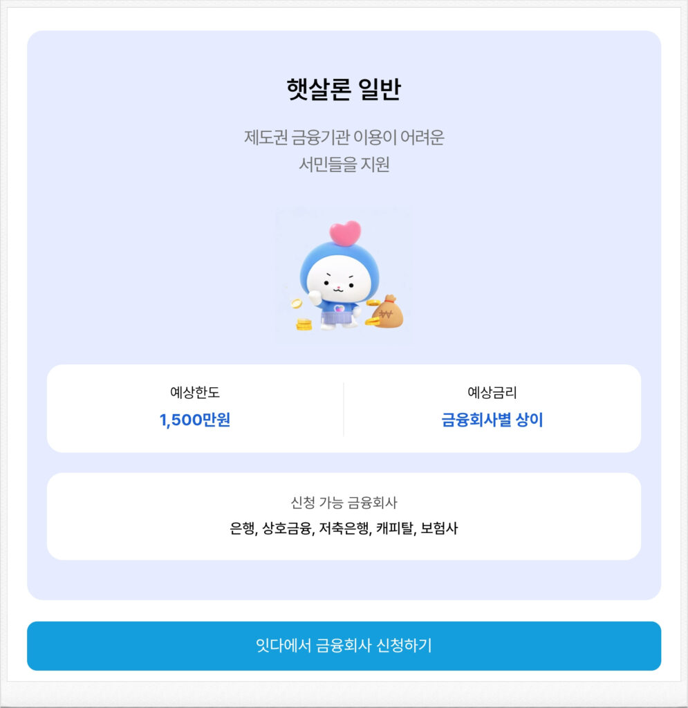 햇살론은 잇다 앱을 통한 통합 조회방식으로 신청이 이루어집니다