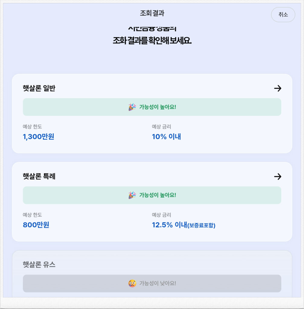 또한 통합 신청결과에서 가능한 대출을 안내받아도 보증심사단계에서 거절되거나 이후 심사 과정에서 최종 거절될수 있습니다 .